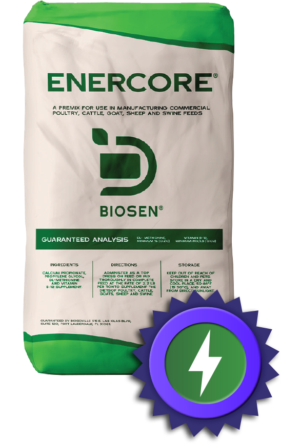 ENERCORE, an energy feed source from Biosen, is an alternative energy source for your animals that utilizes the gluconeogenesis pathway.